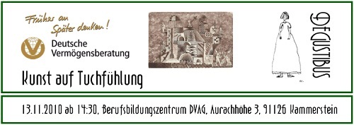 ![]() Am 13 November 2010 veranstaltet DeGustibus die Vernissage "Kunst auf Tuchfühlung" unter der Schirmherrschaft der Deutschen Vermögensberatung im Rahmen der Veranstaltung "Zukunftsperspektiven 2011". Die „Zukunftsperspektiven 2011“ beginnen am Samstag, dem 13. November 2010 um 14:30 Uhr im Berufsbildungszentrum DVAG, Aurachhöhe 3, 91126 Kammerstein. DVAG Kammerstein: http://www.dvag.com/BerufChancen/BBZ-N |